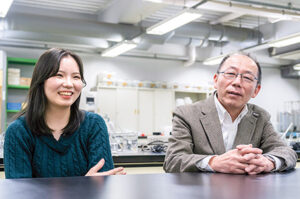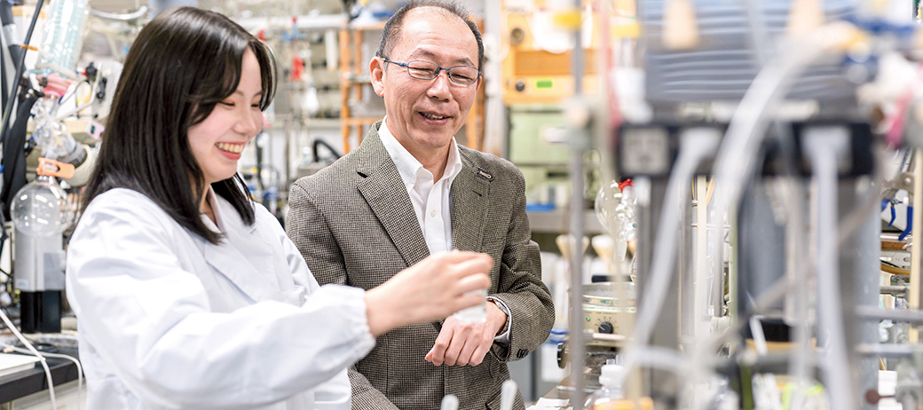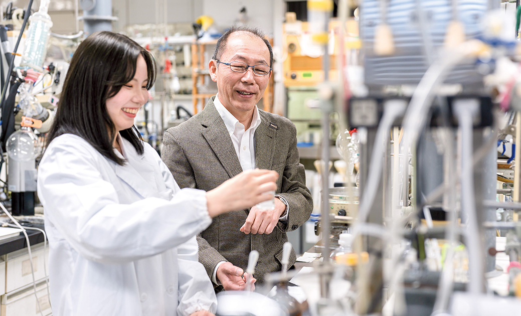 界面活性剤フリーの化粧品や機能性食品などの研究開発に実績を挙げている神奈川大学。2023年4月には、横浜キャンパスに「化学」と「生物学」に関わるテーマをトコトン学べる化学生命学部が新設されました。では同学部ではどんな学びがあり、在学中にどんな力を身につけることができるのでしょうか。同学部で応用化学の教育・研究を行う岡本専太郎教授と教え子のS.Iさんが、化学系の学びについて語り合いました。