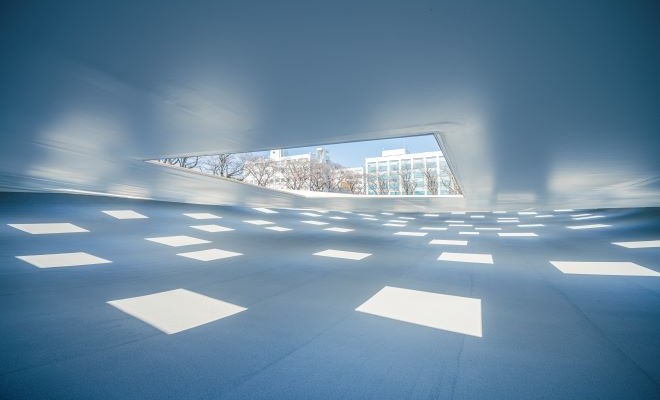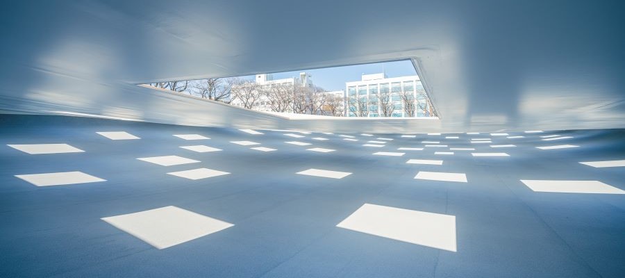 二つ目の施設は、2020年12月に完成した「KAIT広場」、約4,100㎡もの敷地は緩やかな斜面となっており、その上には天井も柱もなく、まるで浮かぶように存在する。屋根にあたるところには59個の開口があり、晴れの日は時間によって光の濃淡が感じられ、雨の日にはシャワーの様に雨水が差し込み、広場の中央部に小さな池が生まれる。ここでは好きな場所に腰掛けたり寝転んだり、思いのまま時間を過ごすことができ、そこにいるだけでリラックスして、自分を見つめ考えることもできる。この空間がもたらす他にない感覚から新たな発想が刺激されるような施設である。この場での経験、発想から、さまざまな活動が生み出されていくことになると思われるKAIT広場は、皆さんも体験しないと分からない施設と言えると思う。